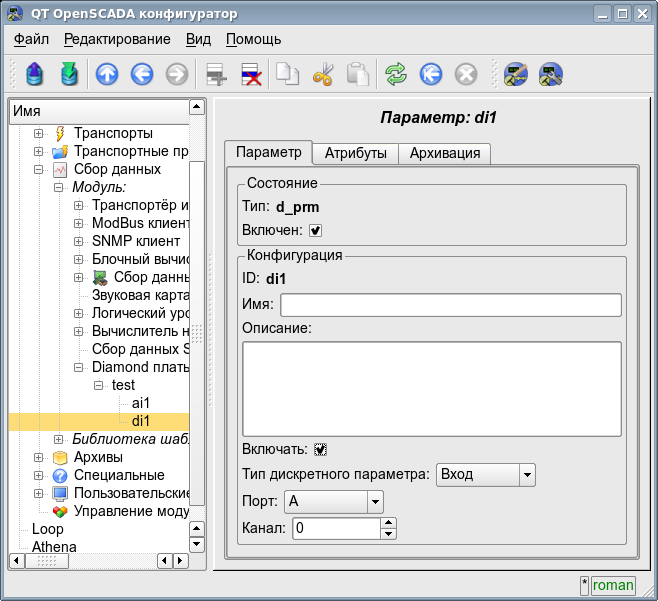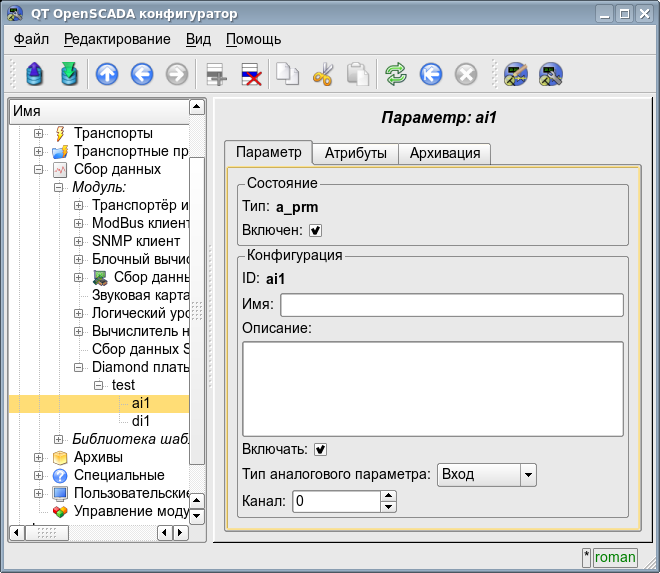 Объект параметра-платы непосредственно содержит конфигурацию отдельно взятой платы и предоставляет все доступные на плате данные в виде атрибутов. Пример вкладки "Параметр", конфигурации параметра-платы в целом, представлена на рис.2, а вкладка "Конфигурация", свойств сигналов, представлена на рис.3.