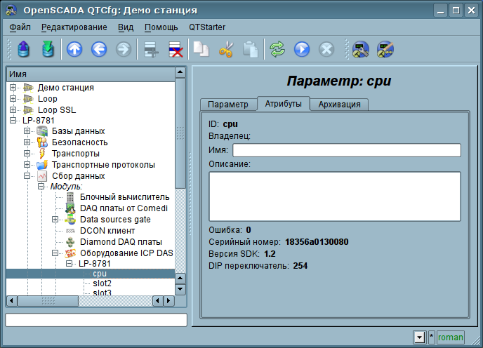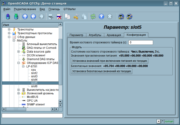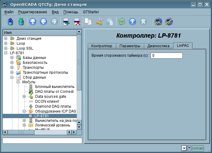 Для конфигурации свойств контроллеров серии LP-8xxx предусмотрена вкладка "LinPAC" на странице контроллера (рис.4), а также параметр "LP-8xxx" (рис.5). В параметре "LP-8xxx" можно получить информацию о серийном номере контроллера, версии SDK, значении DIP и поворотного переключателя. Во вкладке "LinPAC" можно установить значение сторожевого таймера контроллера. Сторожевой таймер контроллера выключается установкой нулевого значения. Обновление значения сторожевого таймера осуществляется в задаче контроллера и с её периодичностью, следовательно зависание задачи опроса приводит к перезапуска контроллера! Значение сторожевого таймера должно быть больше полного времени загрузки системы, до загрузки OpenSCADA, при этом OpenSCADA должна грузиться после запуска синхронизации времени.