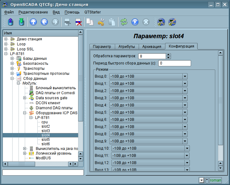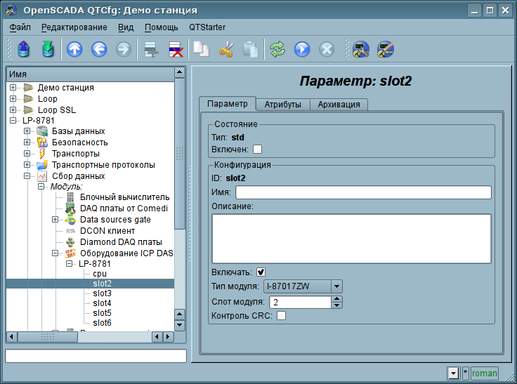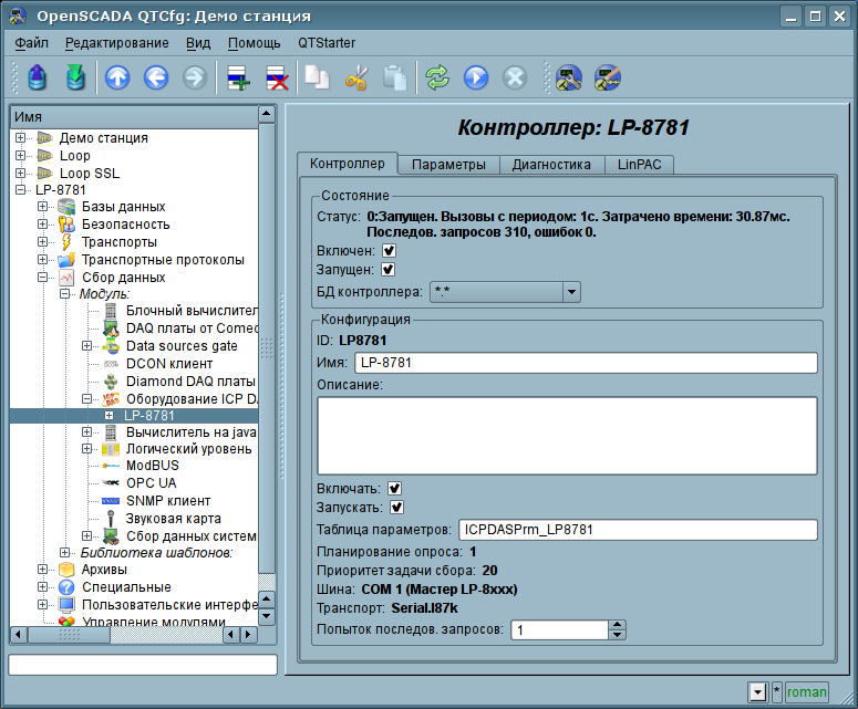 Для добавления источника данных "ICP DAS" создаётся и конфигурируется контроллер в системе OpenSCADA. Пример вкладки конфигурации контроллера данного типа изображен на рис.1.