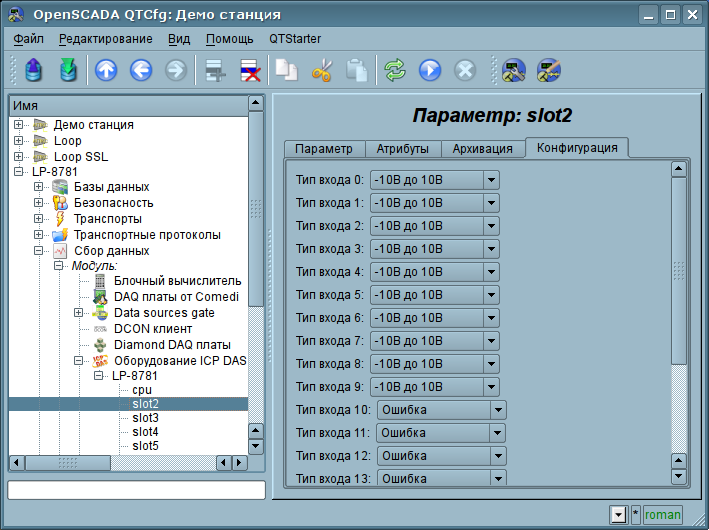 Модулями предоставляется шестнадцать атрибутов аналоговых входов ai{x} и по восемь признаков нарушения верхней ha{x} и нижней la{x} границ, для I-8017. Также модулями предоставляется вкладка "Конфигурация" с расширенной настройкой (рис.6):