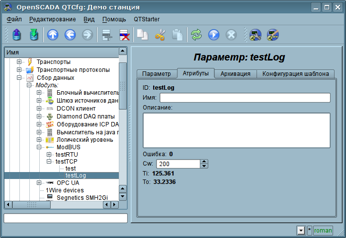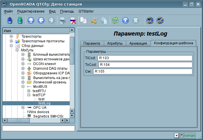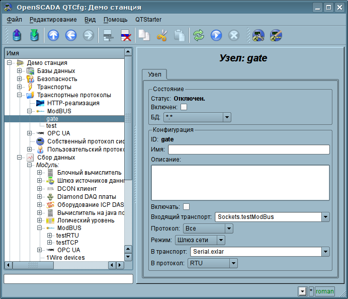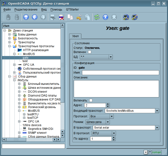 Поскольку узлов протокола может быть создано множество то получается, что на одном интерфейсе, т.е. в одной сети, одна станция на основе OpenSCADA может прозрачно представлять несколько узлов сети ModBus с различными данными.