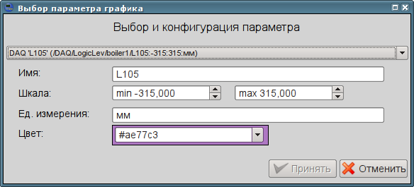 Для выбора параметра в графике предоставляется диалог (рис.27), который содержит комбобокс выбора из перечня доступных параметров и поля индивидуальной настройки свойств выбранного параметра, а именно: имя, шкала, единица измерения и цвет графика.
