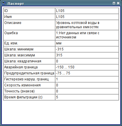 Для параметра, находящегося на открытой в текущий момент времени мнемосхеме, группах графиков или обзорных кадров, может быть вызвано окно паспорта параметра. При этом следует установить «курсор» манипулятора «мышь» на прямоугольник с шифром параметра, его значение или мнемоническое обозначение (например, маленький синий или зелёный кружок) и нажать правую клавишу манипулятора «мышь».
