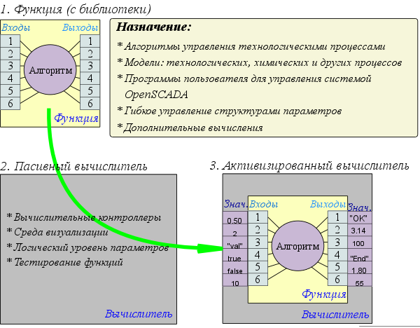 Функционально разработка предназначена для создания в системе OpenSCADA компонентов среды программирования, с помощью которых можно реализовывать различные вычисления и управляющие алгоритмы внутри системы OpenSCADA.