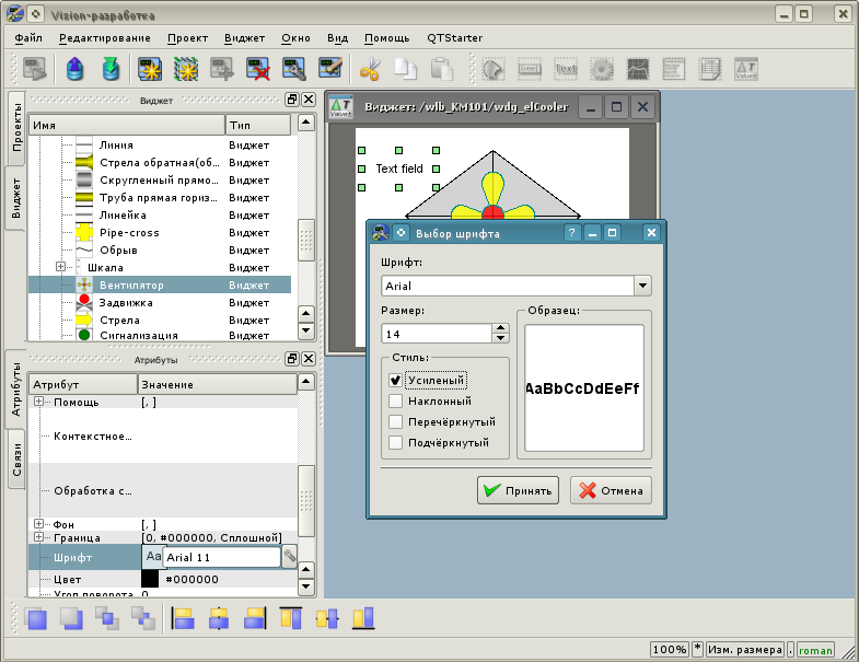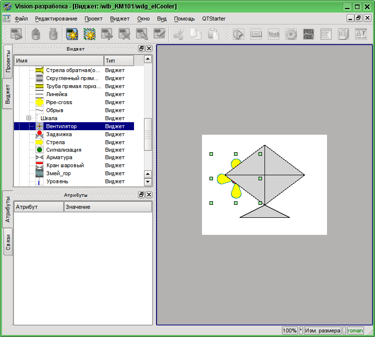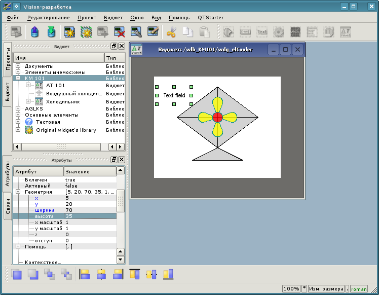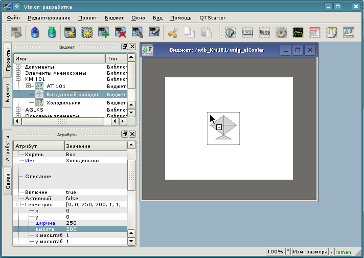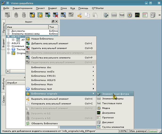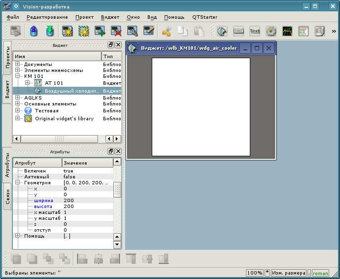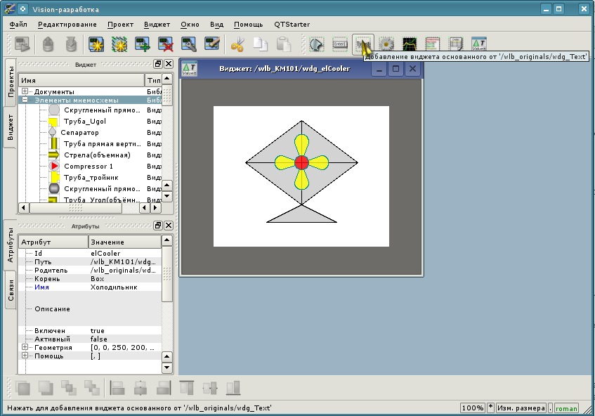 Структуру интерфейса окна конфигуратора можно детально рассмотреть по ссылке http://wiki.oscada.org/Doc/QTCfg. Для нас же сейчас более важно рассмотреть все доступные интерфейсы OpenSCADA, поэтому нажмём предпоследнюю сверху иконку на панели инструментов после чего откроется окно разработки пользовательского интерфейса (рис.3.3).