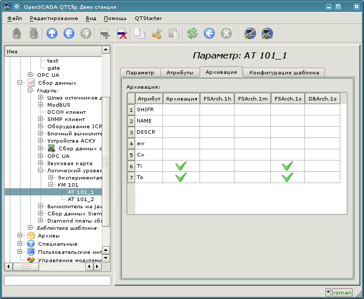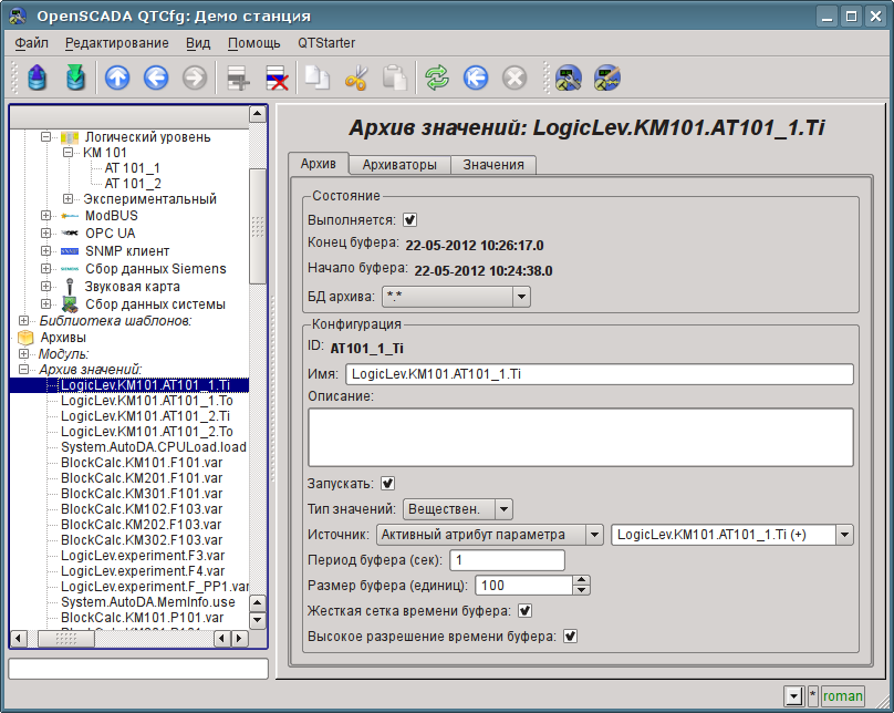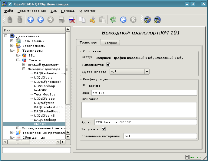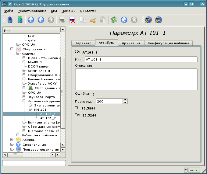 После запуска получим окно графического конфигуратора системы OpenSCADA — QTCfg (рис.3.2) с открытой корневой страницей. Демонстрационная БД специально настроена так, чтобы первым при запуске появлялось окно конфигуратора. В дальнейшем можно открыть окно разработки графических интерфейсов пользователя, а также запустить проект пользовательского интерфейса на исполнение.