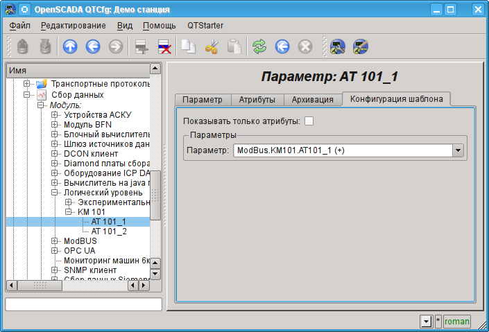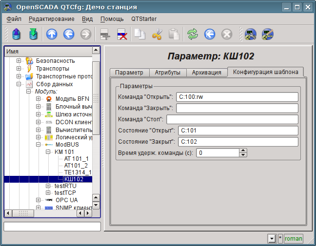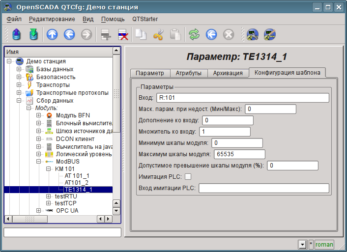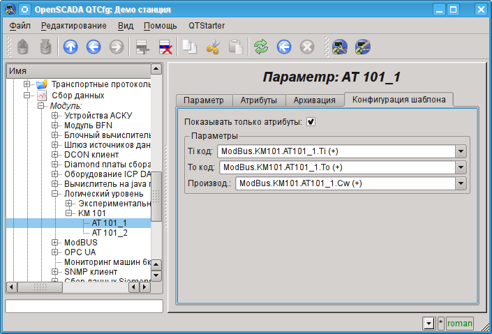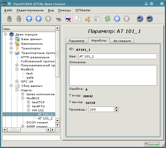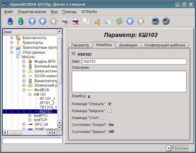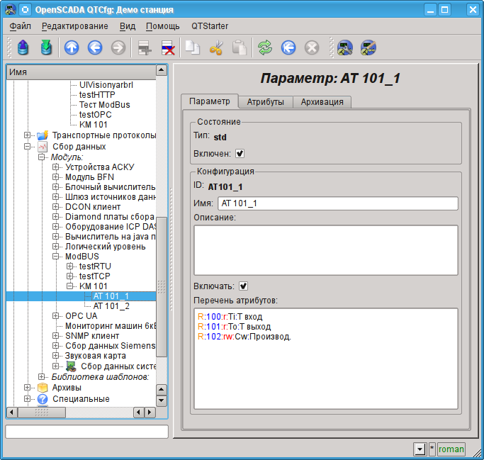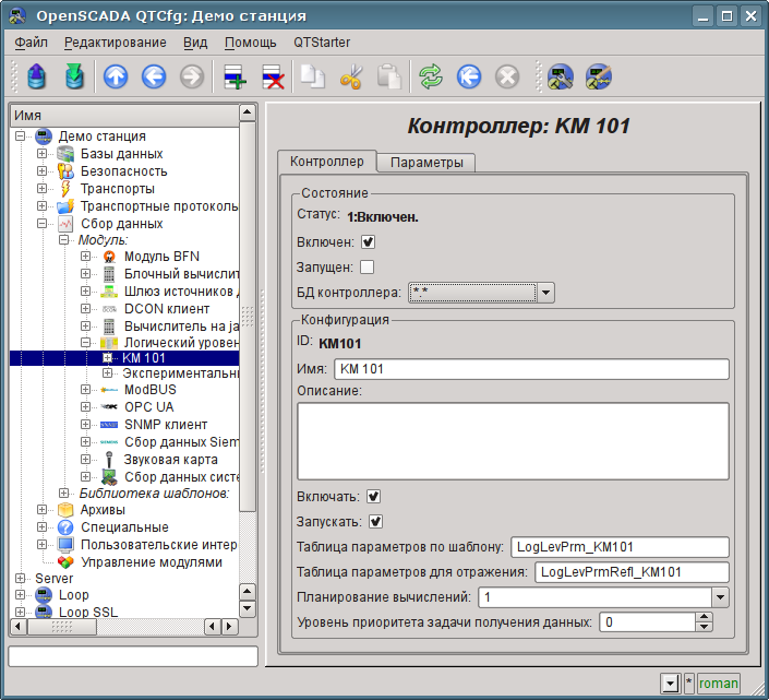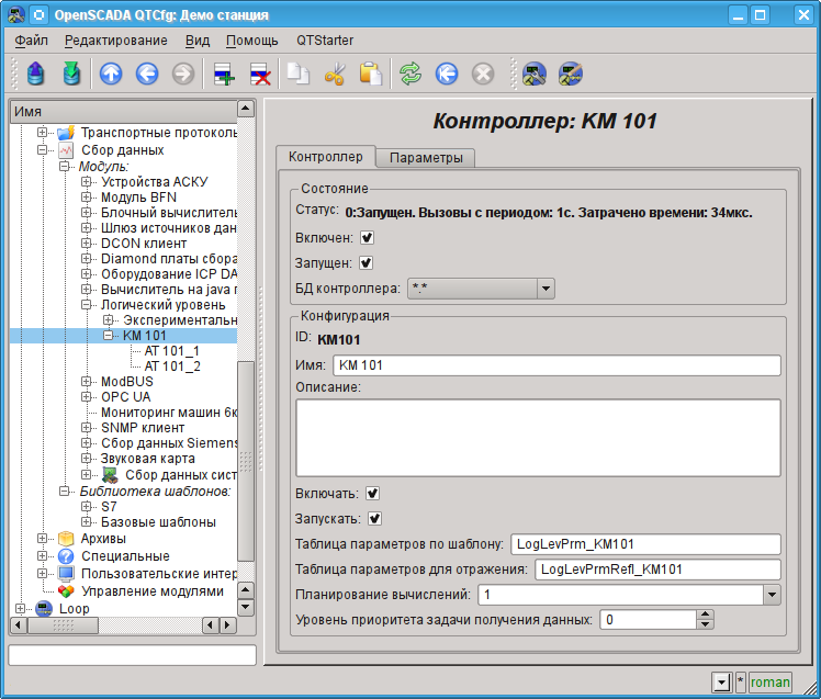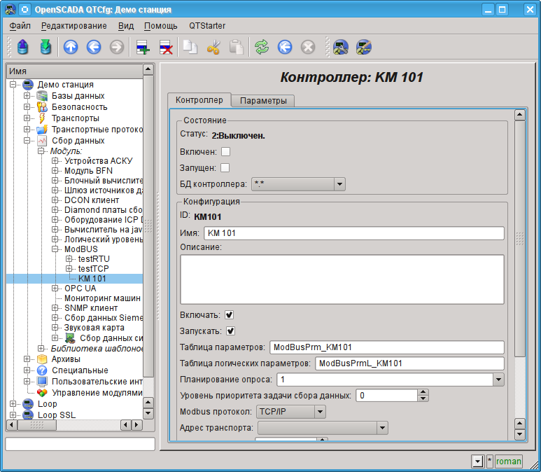Настройки объекта контроллера, как правило, специфичны для разных типов источников данных и протоколов. Детально ознакомиться с настройками объекта контроллера модуля ModBUS можно по ссылке http://wiki.oscada.org/Doc/ModBus#h592-14. Мы же рассмотрим общие и ключевые настройки для модуля ModBUS.