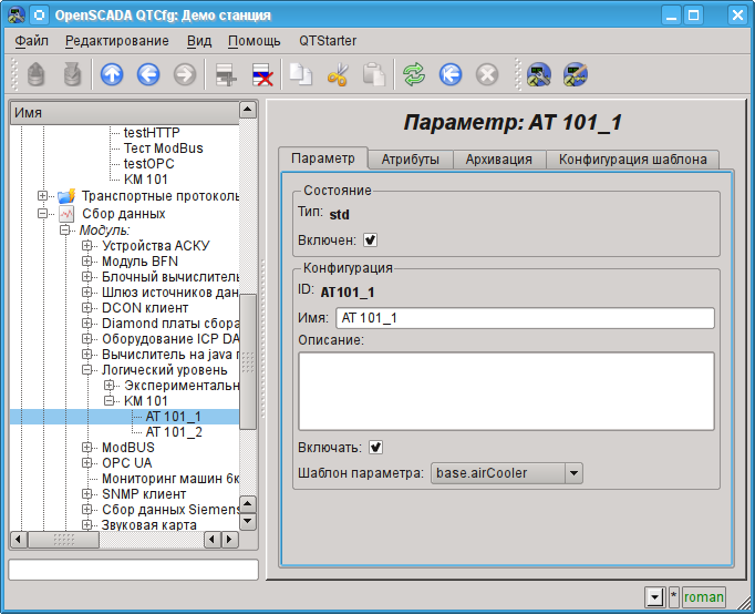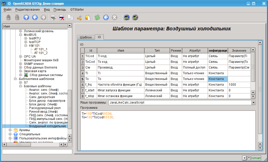 В качестве примера рассмотрим и создадим опрос данных для аппарата воздушного холодильника. Демонстрационная БД содержит модель реального времени ТП компрессорной станции из шести компрессоров. Данные для двух аппаратов воздушных холодильников "AT101_1" и "AT101_2" компрессорной станции "KM101" доступны по протоколу ModBus/TCP на порту 10502.