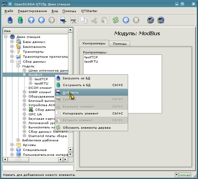 Для опроса данных по протоколу "ModBUS" в OpenSCADA присутствует модуль "ModBUS" подсистемы "Сбор данных". Для добавления нового контроллера откроем в конфигураторе страницу модуля ModBUS ("Демо станция"->"Сбор данных"->"Модуль"->"ModBUS") и в контекстном меню пункта "ModBUS" нажмём "Добавить" (рис.4.1.1).