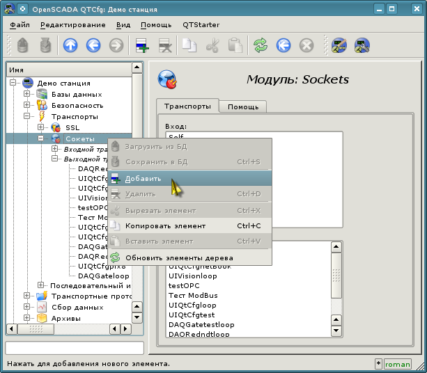Теперь таким же образом, как и объект контроллера, создадим исходящий транспорт в модуле "Sockets" ("Демо станция"->"Транспорты"->"Сокеты") посредством контекстного меню (рис.4.1.4) и назовём транспорт так же, как контроллер: "KM101" и имя "KM 101". Обратите внимание, что в поле "Тип элемента" диалога ввода идентификатора и имени (рис.4.1.2) нужно выбрать "Выходной транспорт"!