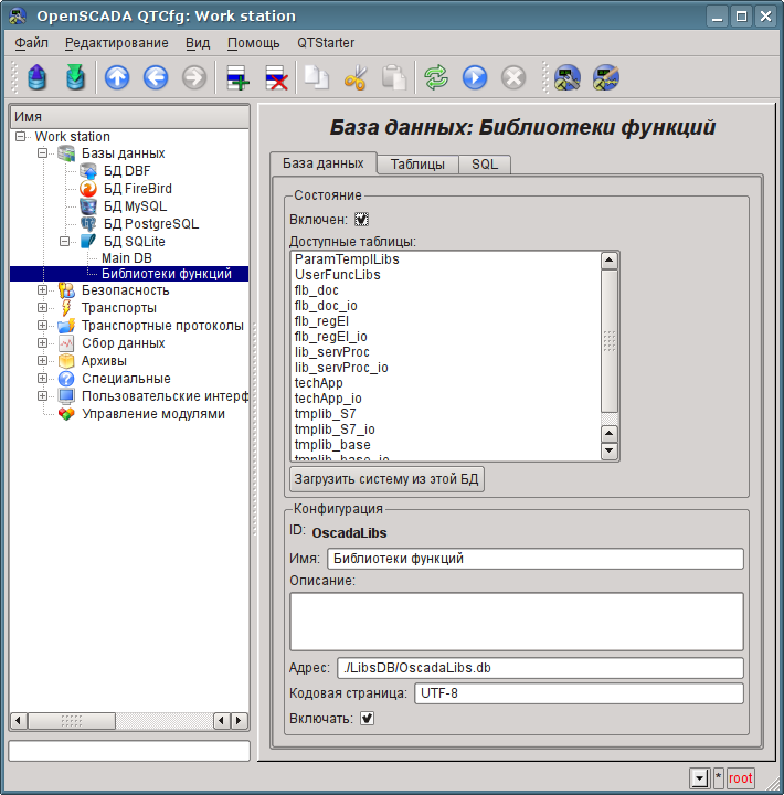 Дистрибутивы OpenSCADA поставляются с рядом библиотек в виде файлов БД "SQLite" (таблица 3.1), которые, при запуске чистого пользовательского проекта, помещаются в директорию "LibsDB/". Согласно этому списку добавляем их в объекте модуля БД "SQLite", устанавливаем им флаг "Включать" и сохраняем. Далее, для загрузки содержимого библиотек можно включить БД и нажать кнопку "Загрузить систему из этой БД", однако при загрузке ряд новых объектов не включатся поэтому проще завершить чистый пользовательский проект и запустить по новой.