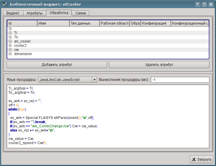 Текущий контекст исполнения СВУ процедур (процедуры виджетов) Вы можете наблюдать на вкладке "Атрибуты" соответствующей страницы или виджета сеанса выполняемого проекта (Рис. 6.6.3). Для добавления некоторых промежуточных значений Вы можете временно добавить и подключить некоторые атрибуты к виджету/странице.