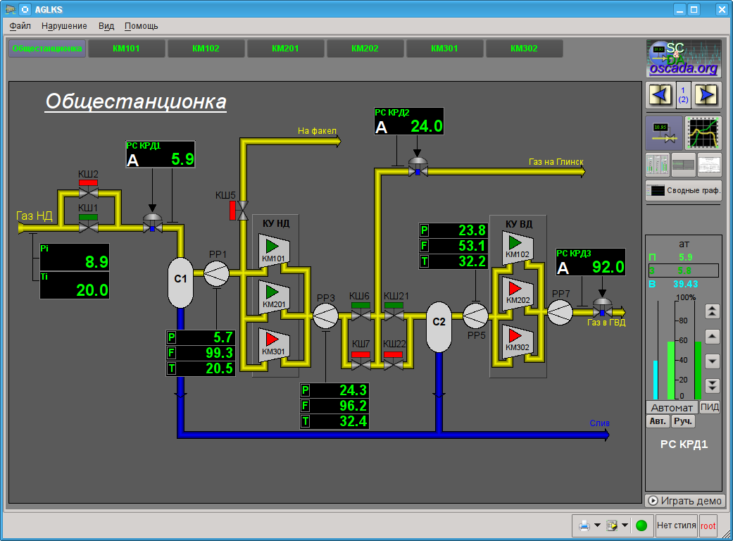 Демонстрация OpenSCADA на основе БД модели "АГЛКС" это не то же что обычно предоставляют коммерческие производители ПО с целью продемонстрировать возможности, но исключить или усложнить нормальную работу путём ограничения функций. Демонстрация OpenSCADA это полно-функциональная система, предоставляющая примеры реализации и настройки различных компонентов. На основе БД модели "АГЛКС" и других моделей OpenSCADA можно легко создавать собственные проекты, используя предоставленные наработки.