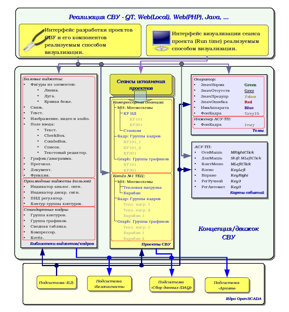 Кадры и пользовательские элементы размещаются в библиотеках виджетов. Из элементов этих библиотек формируются проекты интерфейсов конечной визуализации СВУ. На основе же этих проектов формируются сеансы визуализации.