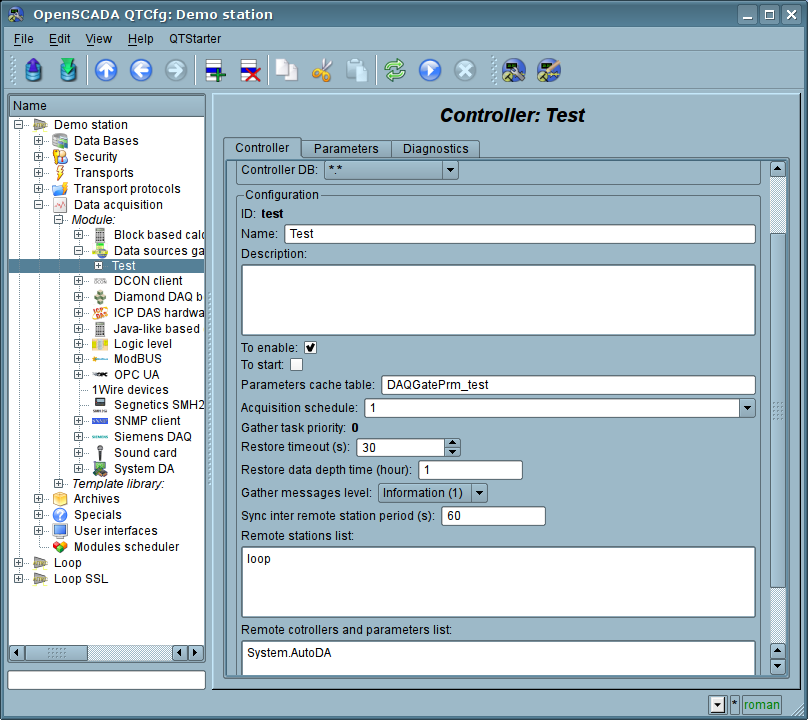 For addition of the data source the controller's object is created and configured in the system OpenSCADA. Example of the configuration tab of the controller is depicted in Figure 2.