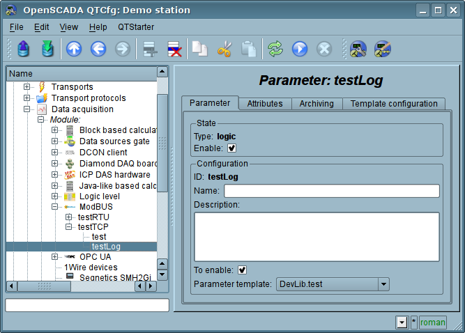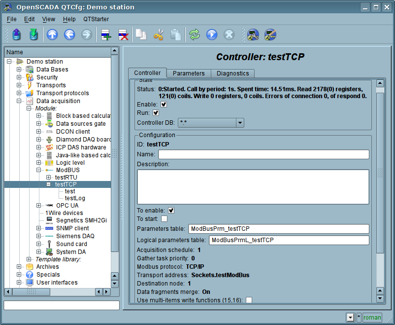 For addition of a ModBus data source the controller is created and configured in the system OpenSCADA. Example of the configuration tab of the controller is depicted in Fig.8.