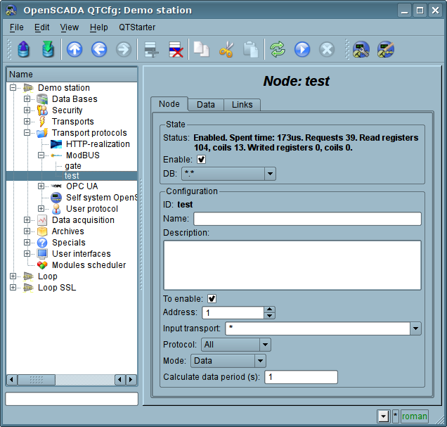 The mode is used to reflect the data of OpenSCADA on arrays of registers and bits of ModBus. The overall configuration of the node is made in the tab "Node"(Fig. 2) by the parameters: