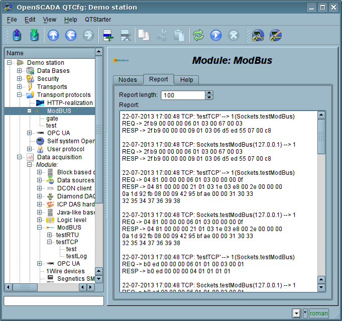 ModBus protocol module contains the code implementing of the protocol part of ModBus, namely particular variants of protocols ModBus/TCP, ModBus/RTU and ModBus/ASCII. Module of the protocol in conjunction with the selected transport is actively used by the data acquisition module for direct queries implementation. Because of the module of the protocol is independent, by using of it you can create additional modules for data acquisition by non-standard functions of the expansion of ModBus of various automation equipment.