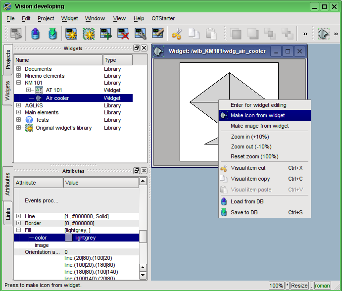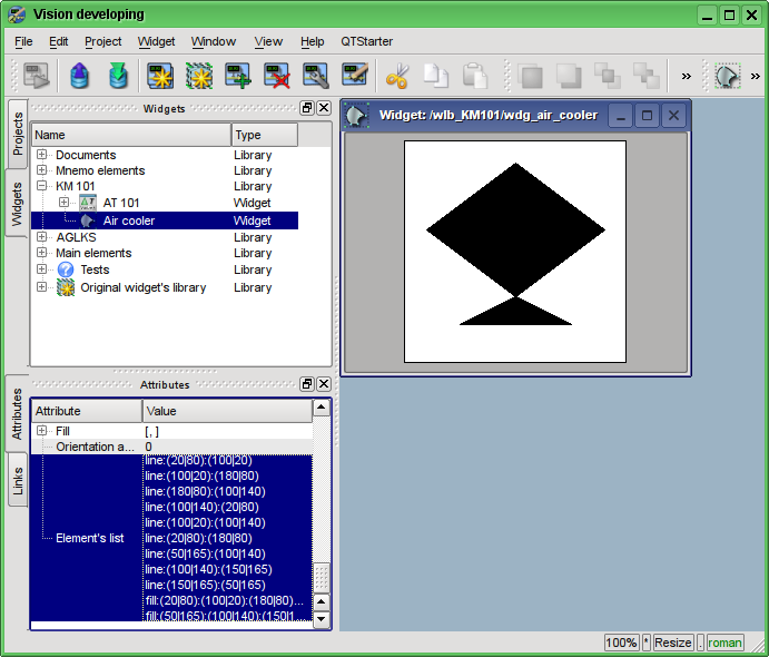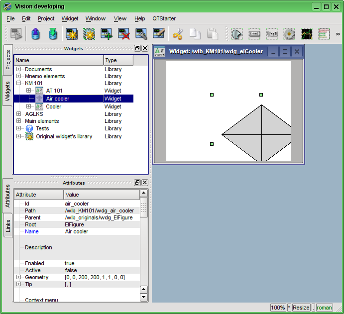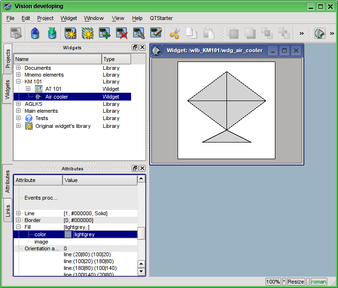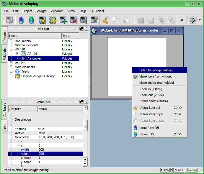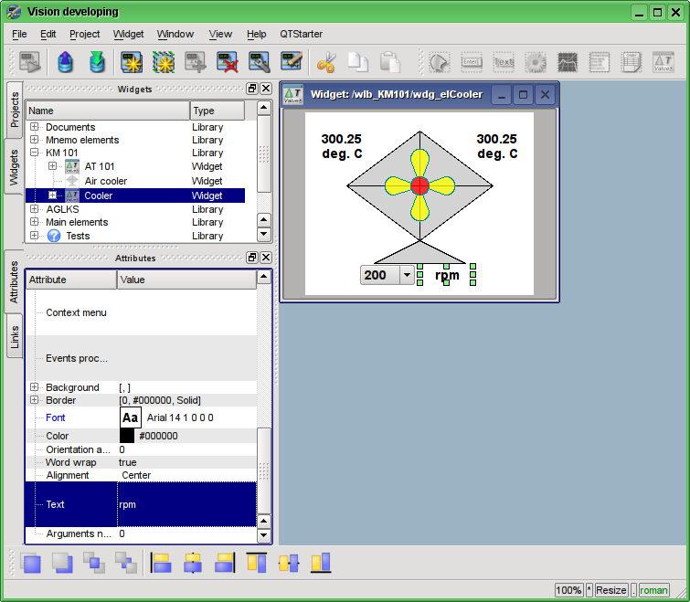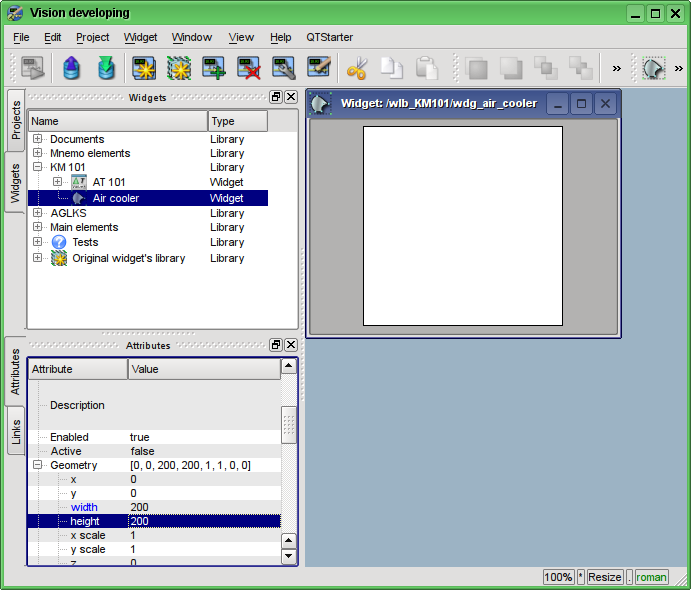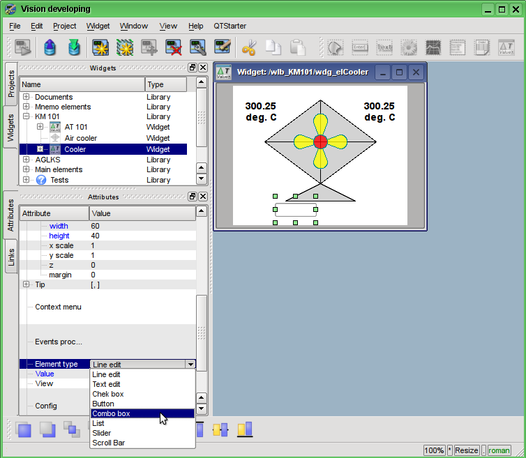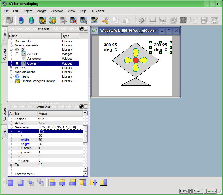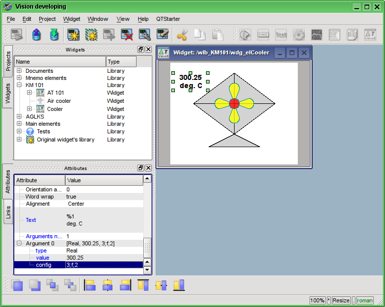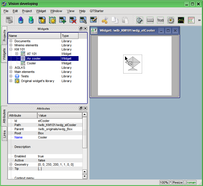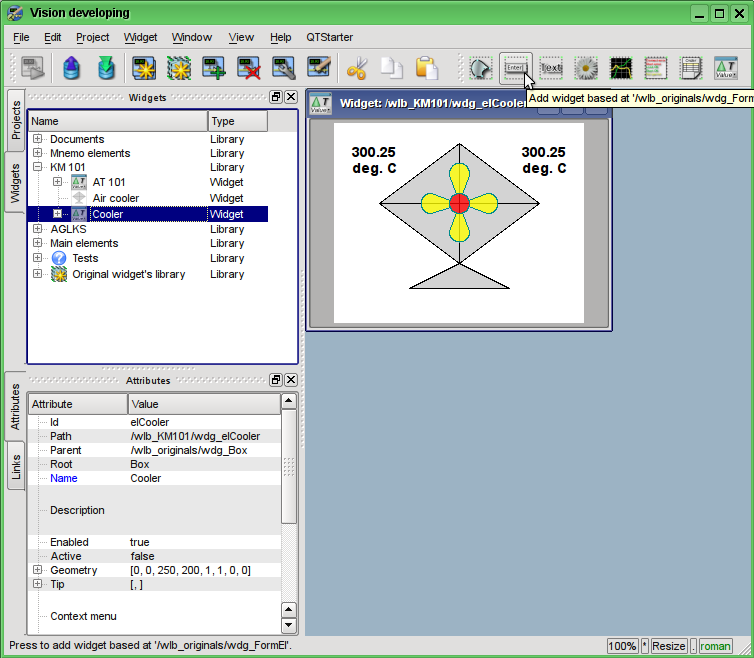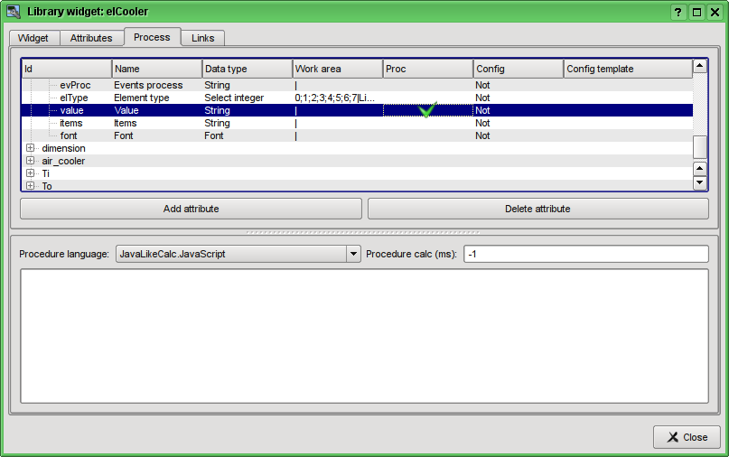 Current execution context of the VCA procedures (procedures of the widgets) you can observe on the tab "Attributes" of the proper page or widget of the session of the executed now project (Fig. 6.6.3). To append some interim values you can temporary append and link some attributes to the widget/page.