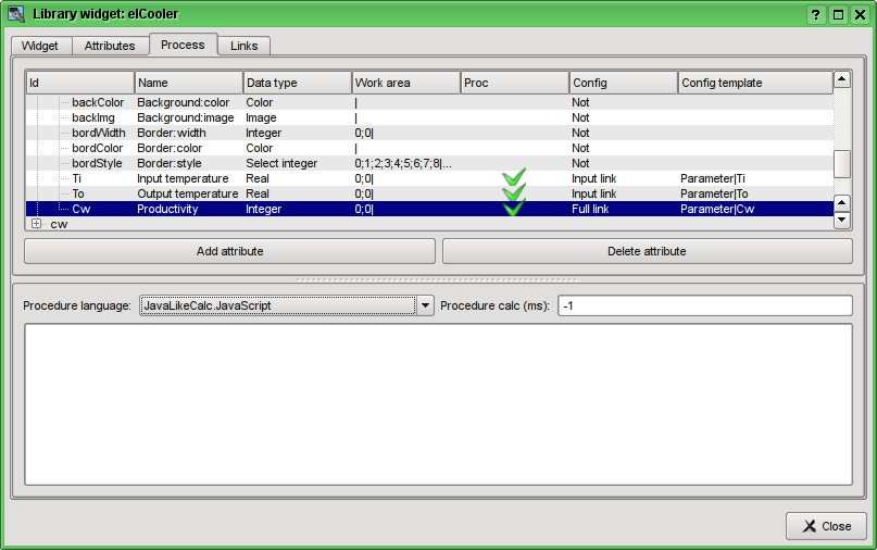 Current execution context of DAQ procedures you can observe into a proper page of the object of the execution context, like: the tab "Attributes" of the Logic Level parameter (Fig. 6.6.1), the tab "Calculation" of the Java-like based calculator (Fig. 6.6.2) and so on. To append some interim values you can temporary append (or set as an read-only attribute) and link some attributes to the template or append and link some IO to the function.