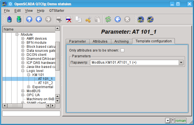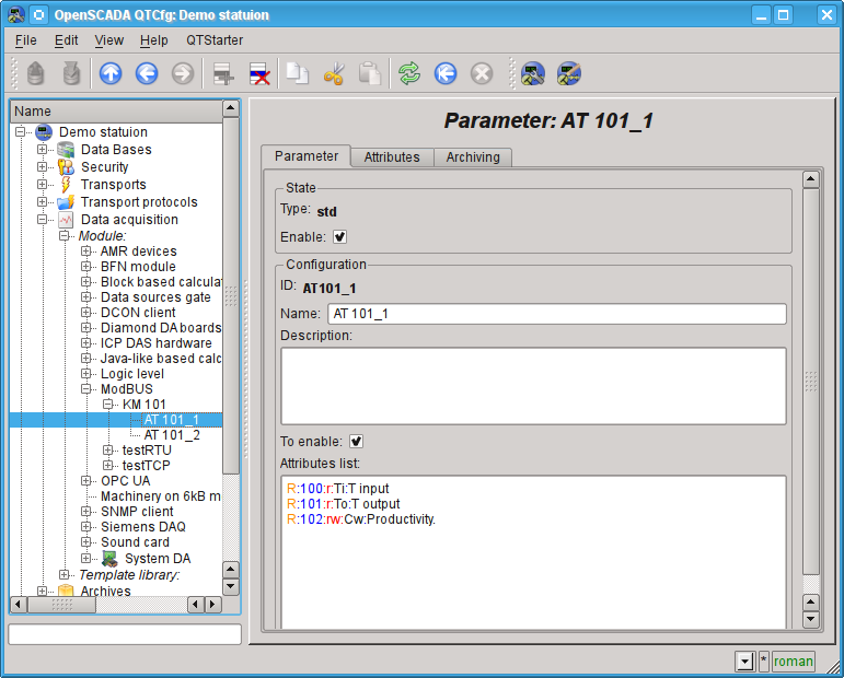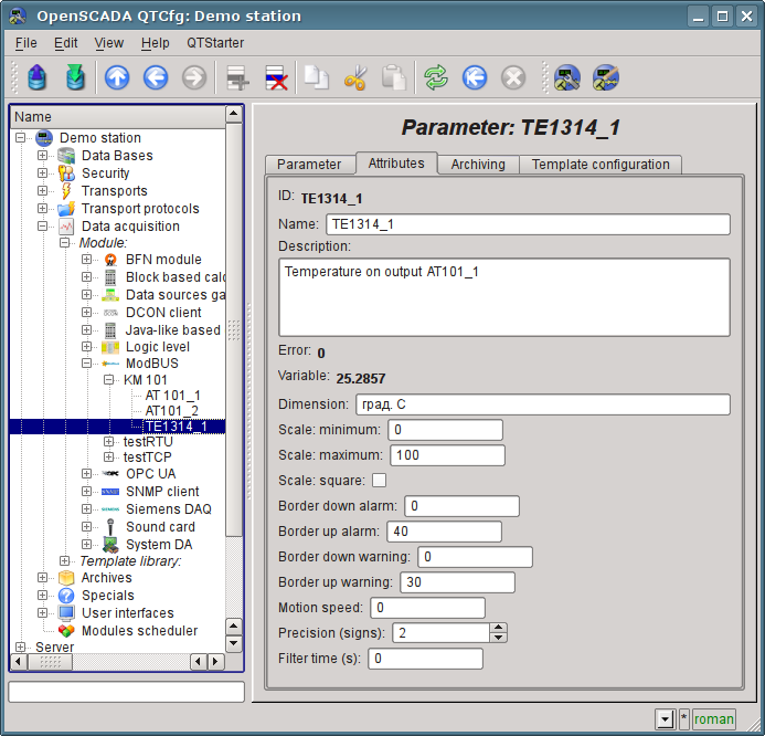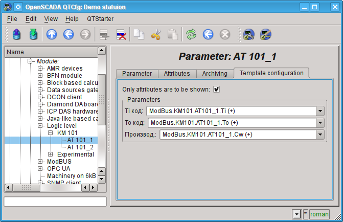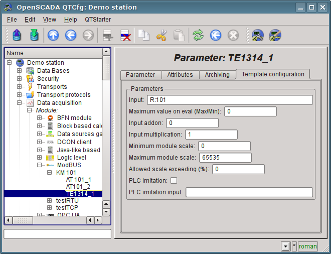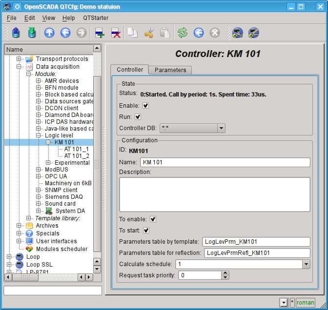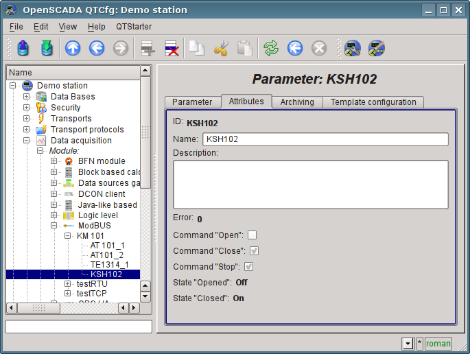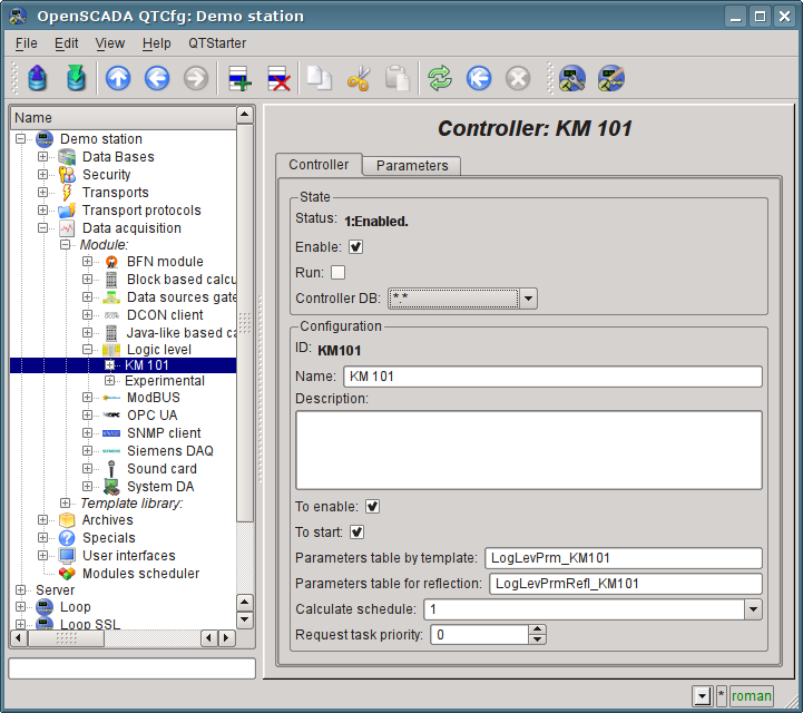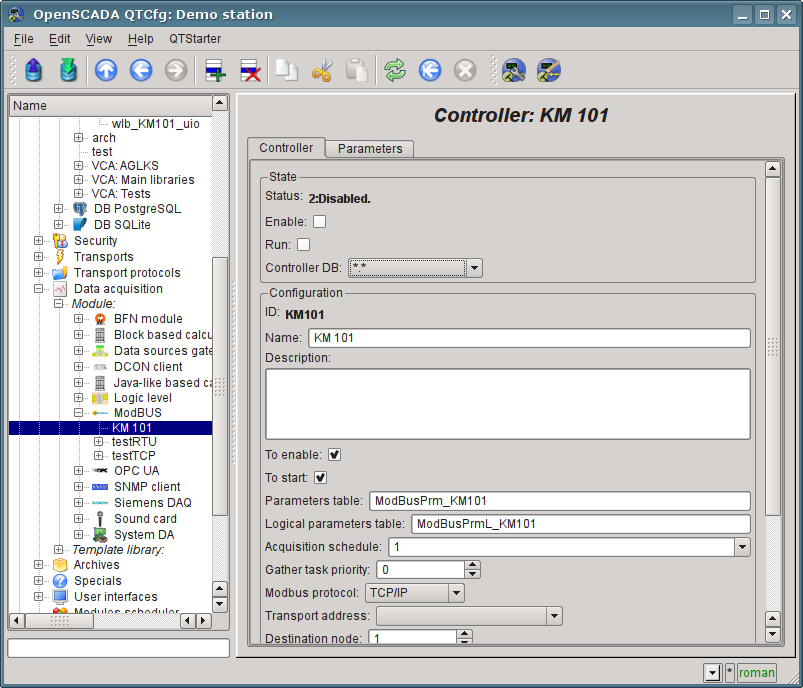 Settings of the controller's object, as a rule, are specific for the different types of data sources and protocols. You can familiarize in details with the settings of the controller's object of the ModBUS module using the link http://wiki.oscada.org/HomePageEn/Doc/ModBus#h871-13. We'll examine the general configuration of the controller's object and the key settings for the ModBUS module.
