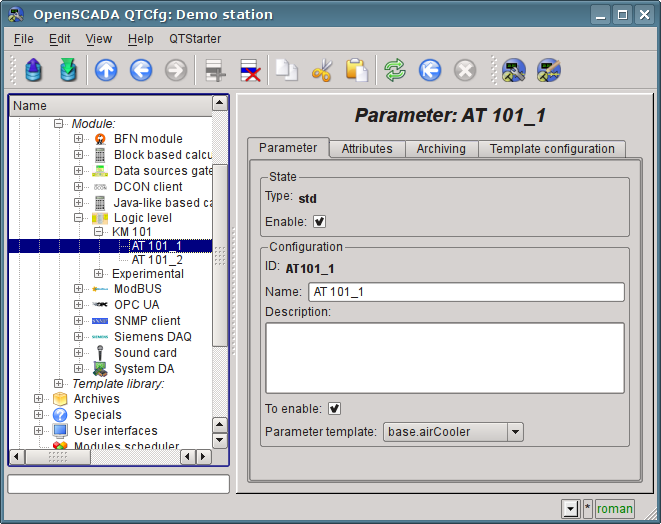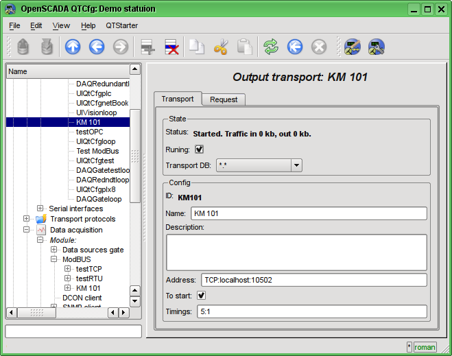 Configurator of OpenSCADA is the main and sufficient instrument for the configuration of any system's component. Like many other components of OpenSCADA, configurator is implemented as a module. Besides the QTCfg configurator there may be available other configurators that performs the same function, but implemented on the basis of other technologies. For example, these are the Web-configurators: WebCfg and WebCfgD.