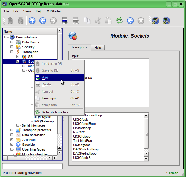There is "ModBUS" module in the "Data acquisition" subsystem for the data acquisition via "ModBUS" protocol in OpenSCADA. To add a new controller we will open the page of the "ModBUS" module in the configurator ("Demo Station"->"Data acquisition"->"Module"->"ModBUS") and in the pop-up menu of the "ModBUS" item lets click "Add" (Fig. 4.1.1).
