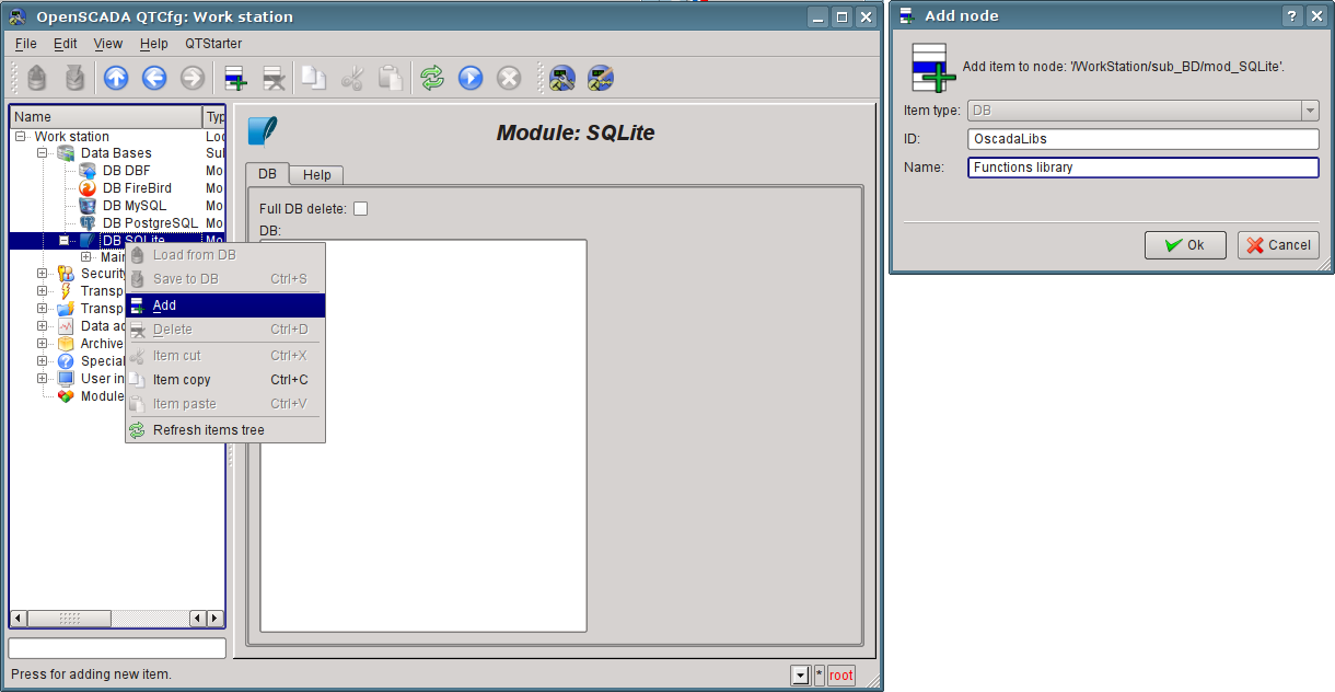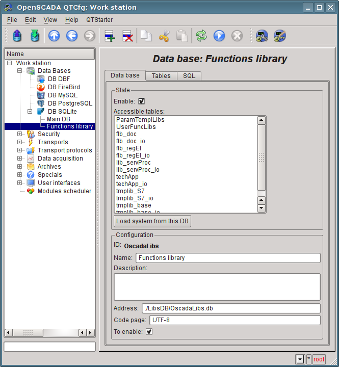 OpenSCADA distributions supplied with a number of libraries in the form of "SQLite" database files (Table 3.1), which, when you run the clean user's project are placed to the "LibsDB/" directory. According to this list, lets add them in the "SQLite" database module's object, set the "Enabled" flag and save. Next, to load the library contents it is necessary to enable the database and click "Download this system from the database", but during the loading some of new objects are disabled so it's easier to complete a exit user's project and start over again.