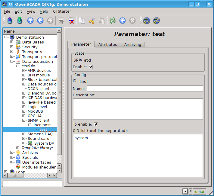 For addition of the SNMP data source the controller is created and configured in the system OpenSCADA. Example of the configuration tab of the controller is depicted in Figure 1.