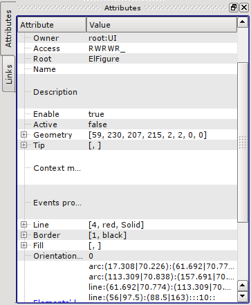 Using the "Line" field of the "Attributes" tab, lets define the width, color, lines' style of the figures which we'll draw. With the "Border" field lets define the width and color of the border. The "Fill" field allows you to specify color, and image for the fills. "Elements' list" contains a list of primitives used to create the graphic object. Elements of all fields of the "Attributes" tab can be dynamically changed in the scripts (programs) of the user.
