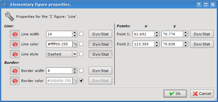 Editing the coordinates of control points is made either with the mouse or through changes in the "Elements' list " for static points, or directly in the "Attributes" tab, having the dynamic ones ("Point 1"...). Editing the other properties is made by means of changing the contents of the fields "Line", "Border", "Fill" of the "Attributes" tab or the "Elements' list".