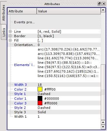 Then the "Attributes" tab will be appended by the fields: Point 1 (1), Point 2 (2), Width 1(w1), Width 2(w2), Color 1(c1), Color 2(c2), Style 1 (s1) (Fig. 5.3.b), values of these fields can be changed programmatically, by using a programming language of the OpenSCADA project. It is obvious that if desired not all properties of the primitive can be declared dynamic, but one or several, besides one dynamic property can be used repeatedly.