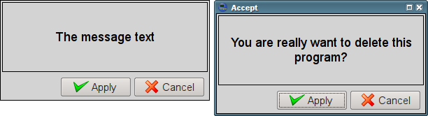 This widget can be used by the developer to create dynamic interaction frames in operations that require acception by the user. To use it you should add this item to the panels' logical container of the project's tree. For interaction this widget is opened by the frame-initiator the result of it is dynamic linkage of the dialogue with the "event" and "mess" attributes of the frame-initiator. The question message is taken from the "mess" attribute, and the "dlg_Apply" signal is transmitted to the "event" at acception.