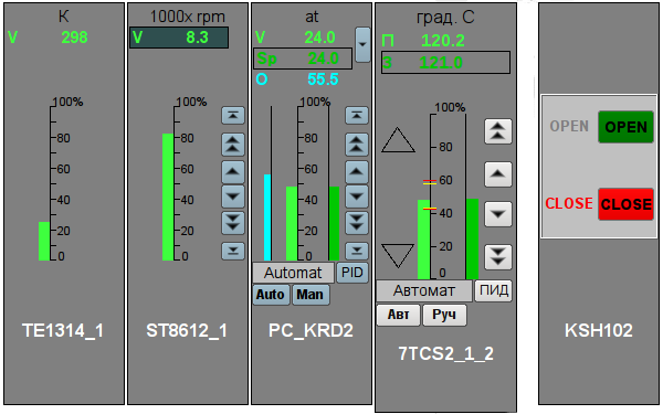 Element, shown in Fig. 5, provides for simultaneous monitoring and control of several contours up to eight, includes both instances of the widget "Element cadr for each contour, and a widget "Diagram" to monitor the trends of the contours and viewing history .