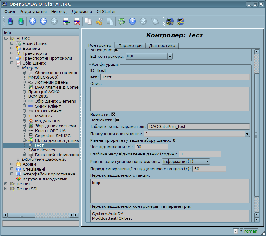 Для додання джерела даних створюється та налаштовується об'єкт контролеру у системі OpenSCADA. Приклад вкладки конфігурації контролеру даного типу зображено на рис.2.