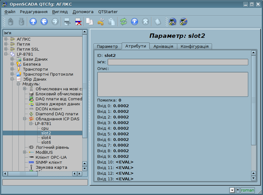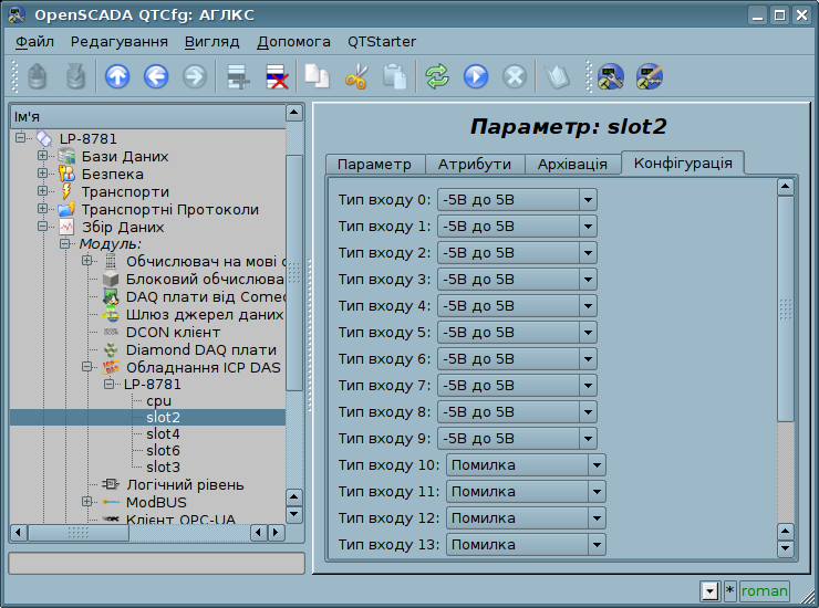 Модулями надається шістнадцять атрибутів аналогових входів ai{x} та по вісім ознак порушення верхньої ha{x} та нижньої la{x} границь, для I-8017. Також модулями надається вкладка "Конфігурація" з розширеним налаштуванням (рис.6):
