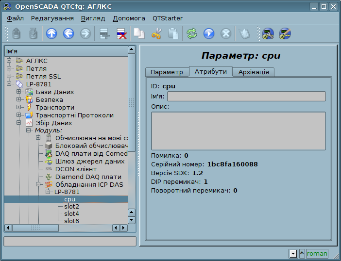 Для додання джерела даних "ICP DAS" створюється та конфігурується контролер у системі OpenSCADA. Приклад вкладки конфігурації контролеру даного типу зображено на рис.1.