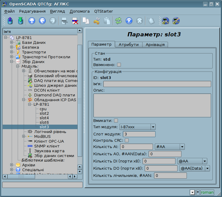 Модулі серії I-87xxx встановлюються до слоту послідовної шини кошику контролеру, наприклад, серії LinPAC. У таблиці 2 наведено властивості модулів "ICP DAS" серії I-87xxx, які реалізуються у OpenSCADA.