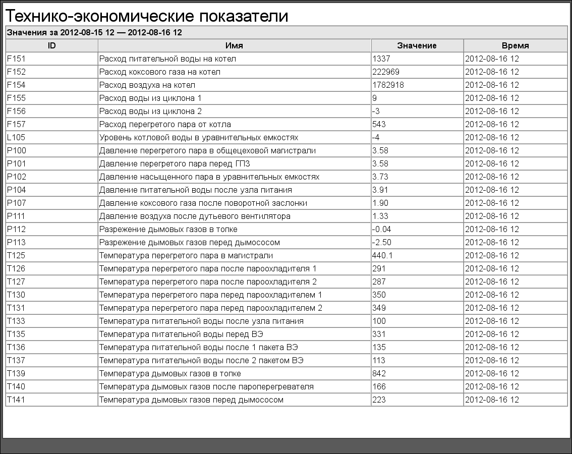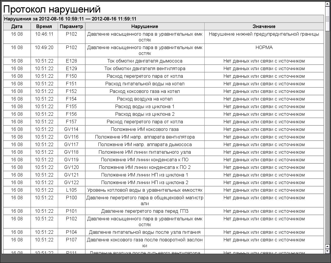 В процессе работы была получена исходная конфигурация ПЛК и АРМ-оператора, из которых сформирована результирующая таблица параметров, их свойства и назначения на физические каналы. Суммарно система содержит 37 (из 64) аналоговых и 98 (из 288) дискретных сигналов.