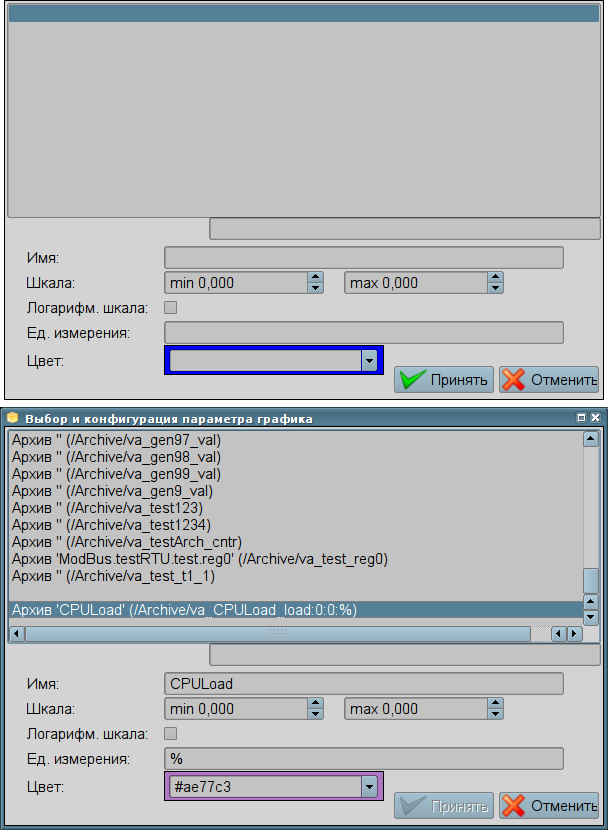 Элемент "Выбор параметра графика", представленный на рис. 33, реализует диалог выбора источника данных, часто архивных, для формирования графика в кадре "Группа графиков". Выбор предоставляется из перечня указанного в атрибуте "Параметры доступные для выбора (allowSelLst)", кадра-инициатора. Для выбранного источника можно указать имя, шкалу, единицу измерения и цвет графика.
