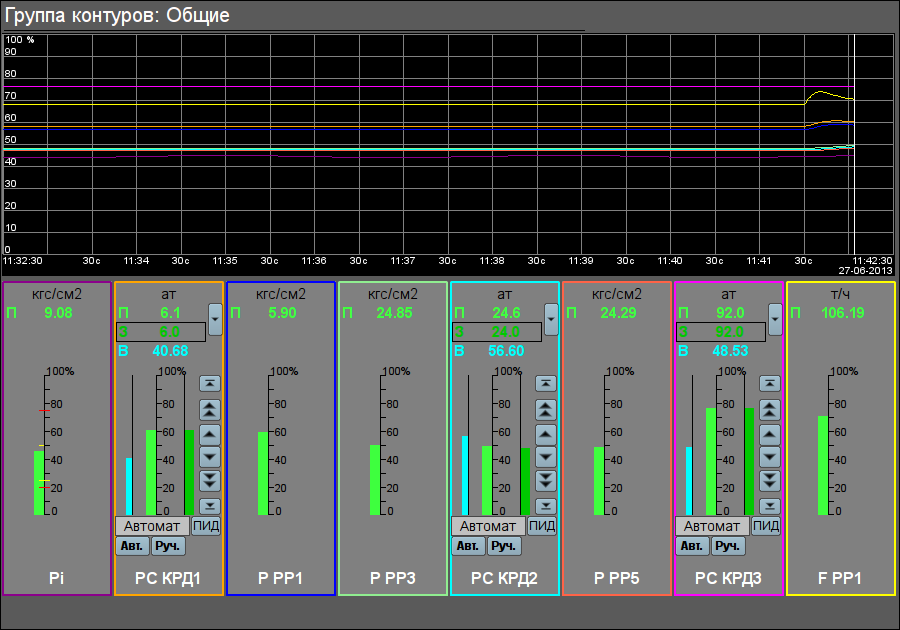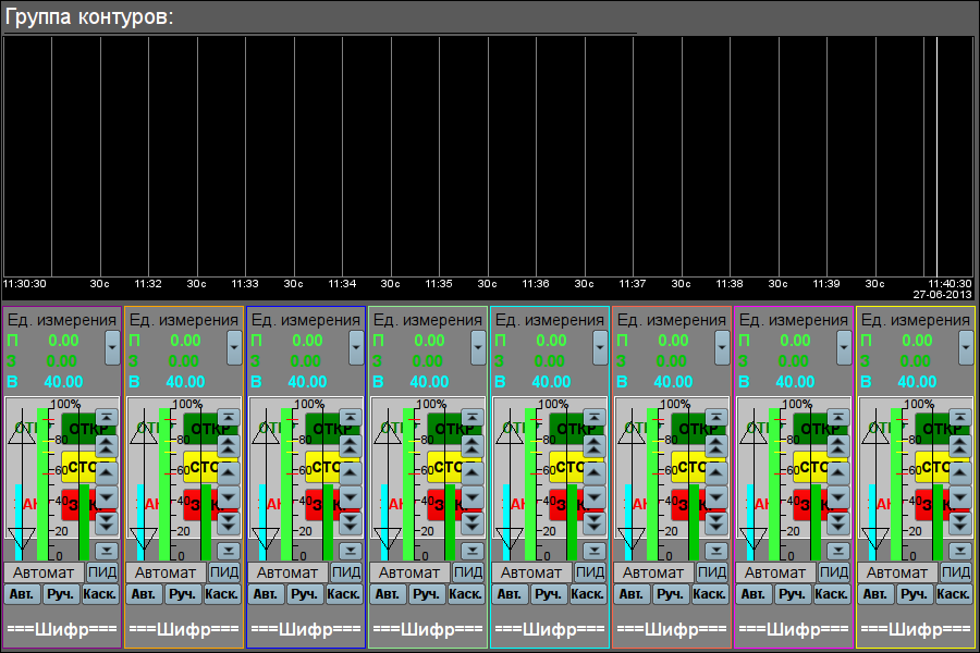 Элемент, представленный на рис. 5, служит для одновременного наблюдения и управления несколькими контурами, до восьми, включает в себя как экземпляры виджета "Элемент кадр" для каждого контура, так и виджет "Диаграмма" для наблюдения за трендами контуров и просмотра истории.