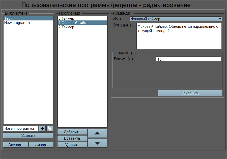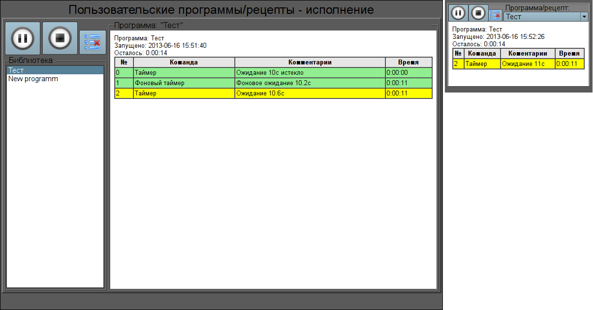 Исполняемый рецепт-программа может быть приостановлен путём нажатия кнопки "Пауза" в месте кнопки "Запуск" или прерван путём нажатия кнопки "Останов". Также возможно пропустить шаг нажав кнопку "Пропустить", в момент исполнения шага.