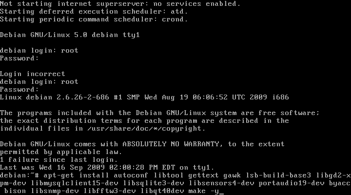 apt-get install autoconf libtool gettext gawk lsb-build-base3 libgd2-xpm-dev libmysqlclient15-dev libsqlite3-dev libsensors-dev portaudio19-dev byacc bison libsnmp-dev libfftw3-dev libqt4-dev make -y