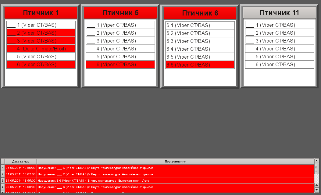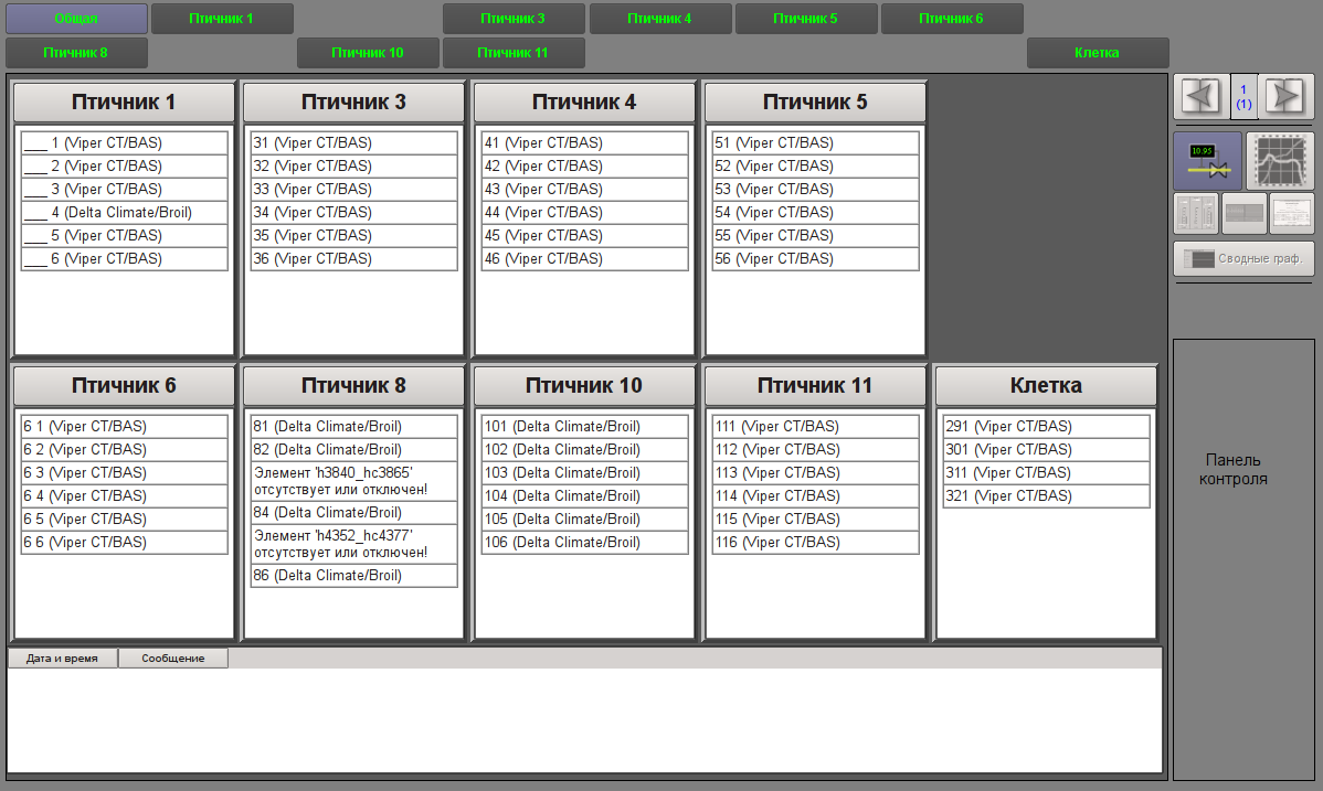 Сверху общего интерфейса представлены кнопки выбора объекта сигнализации с общим кадром и кадрами отдельных птичников. При наличии нарушения подсвечивается соответствующая птичнику кнопка объекта сигнализации, что позволяет оператору перейти к птичнику с проблемой и быстро её локализовать.