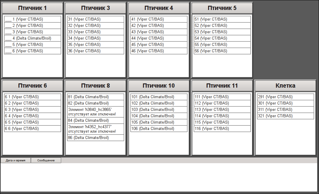 Кадр, в виде блоков отдельных птичников, содержит состояния нарушений по каждому помещению птичника и нарушение по птичнику в целом (рис.3). По нажатию на кнопку состояния птичника можно перейти на кадр детализации нарушений и данных по отдельно-взятому птичнику. Снизу кадра сводной информации приведена таблица с общим перечнем нарушений по птичному хозяйству. Согласно изображению ниже присутствуют нарушения в помещениях 2-4, 6 птичника 1.